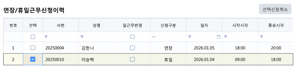 - 연장·휴일근무 승인 상태 관리