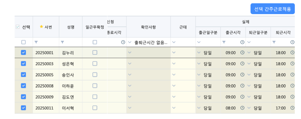 출퇴근 시간이 없는 경우 관리자가 정시 출퇴근으로 일괄 변경할 수 있습니다.