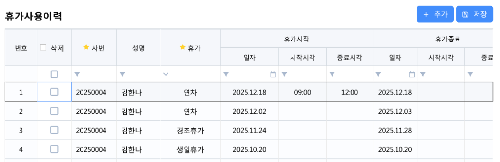 직원이 실제로 사용한 휴가 내역을 조회·추가·삭제합니다.