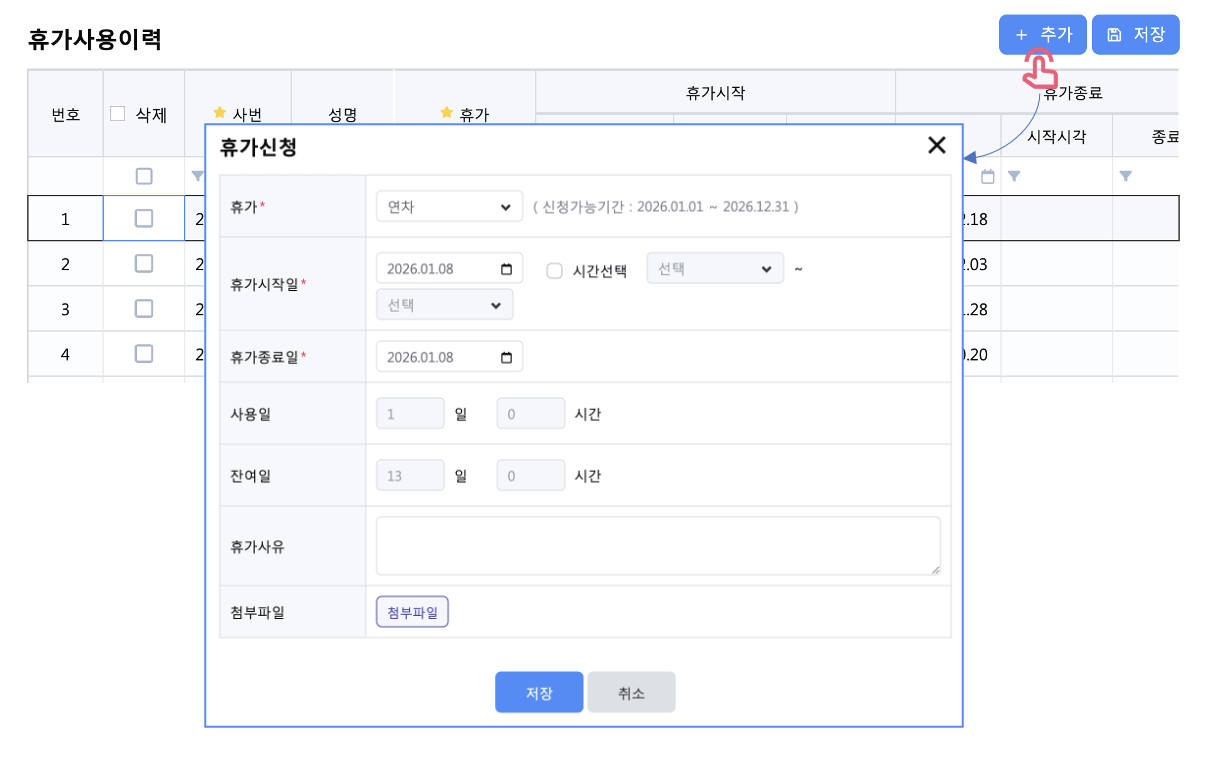 📌 약정휴가(병가, 하계휴가 등) 는 해당 직원의 사용 가능 기간이 먼저 등록되어 있어야 휴가 사용이력 등록이 가능합니다.