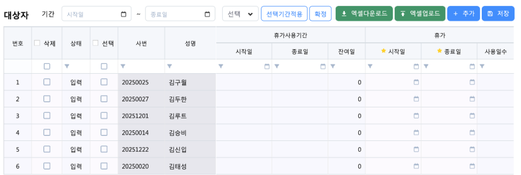 이 단계에서는 아직 휴가가 부여되지 않으며, 일괄 등록을 위한 관리 항목만 생성됩니다.