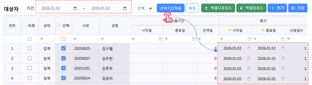 4. 휴가 일괄등록 저장 및 확정하기 #