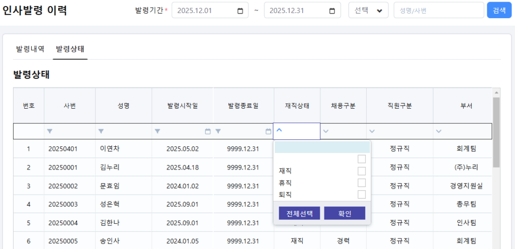 발령상태탭을 클릭합니다. - 필터 영역에서 재직상태를 선택합니다.