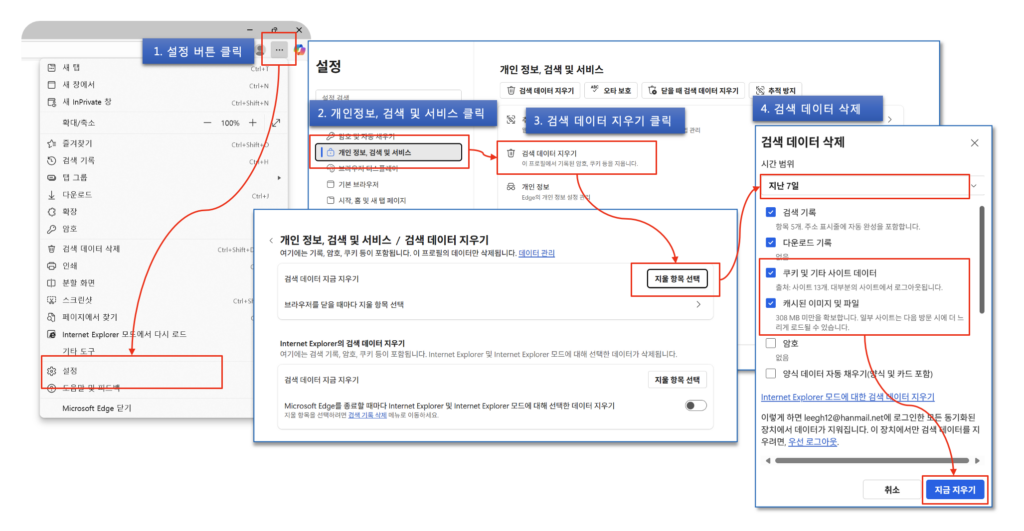 - 기간 선택 → 캐시된 이미지 및 파일 체크 (필요 시 쿠키 및 기타 사이트 데이터)