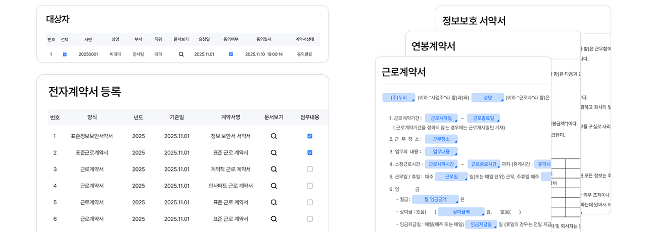 표준·연봉계약서 등 기본 양식은 물론, 회사 고유 양식으로도 계약서를 구성할 수 있어요.계약 대상자 지정부터 요청·동의·완료까지 전 과정을 시스템에서 관리합니다.