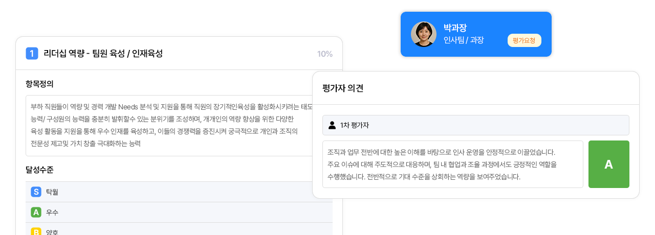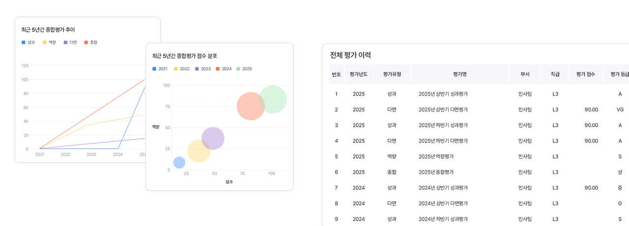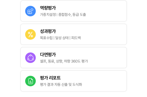 역량평가·성과평가·다면평가를 모두 지원하여 조직의 평가 목적에 맞게 구성할 수 있어요.