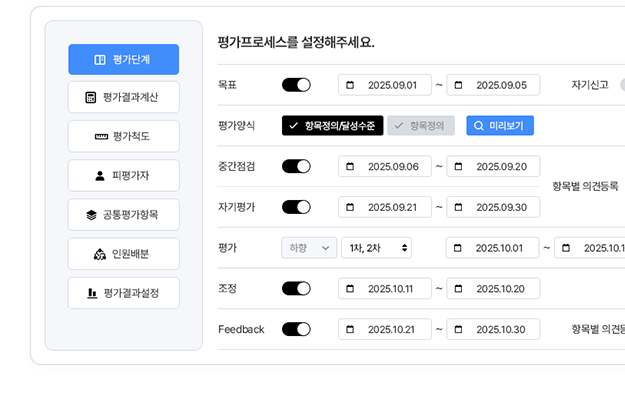 평가척도, 항목, 피평가자 그룹, 평가방식(상대·절대평가, 편향보정, 인원배분 등)도 유연하게 설정할 수 있습니다.