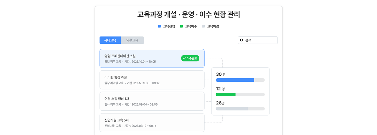 직무역량 개발에 필요한 사내·사외 교육을 개설하고 운영할 수 있어요.구성원의 수강신청과 이수현황이 인사정보와 연동되어 한눈에 관리됩니다.